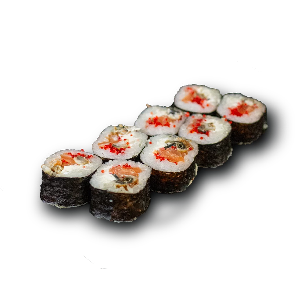 Fresh salmon, frozen eel, tobiko roe, cream cheese, rice, cloud seaweed.