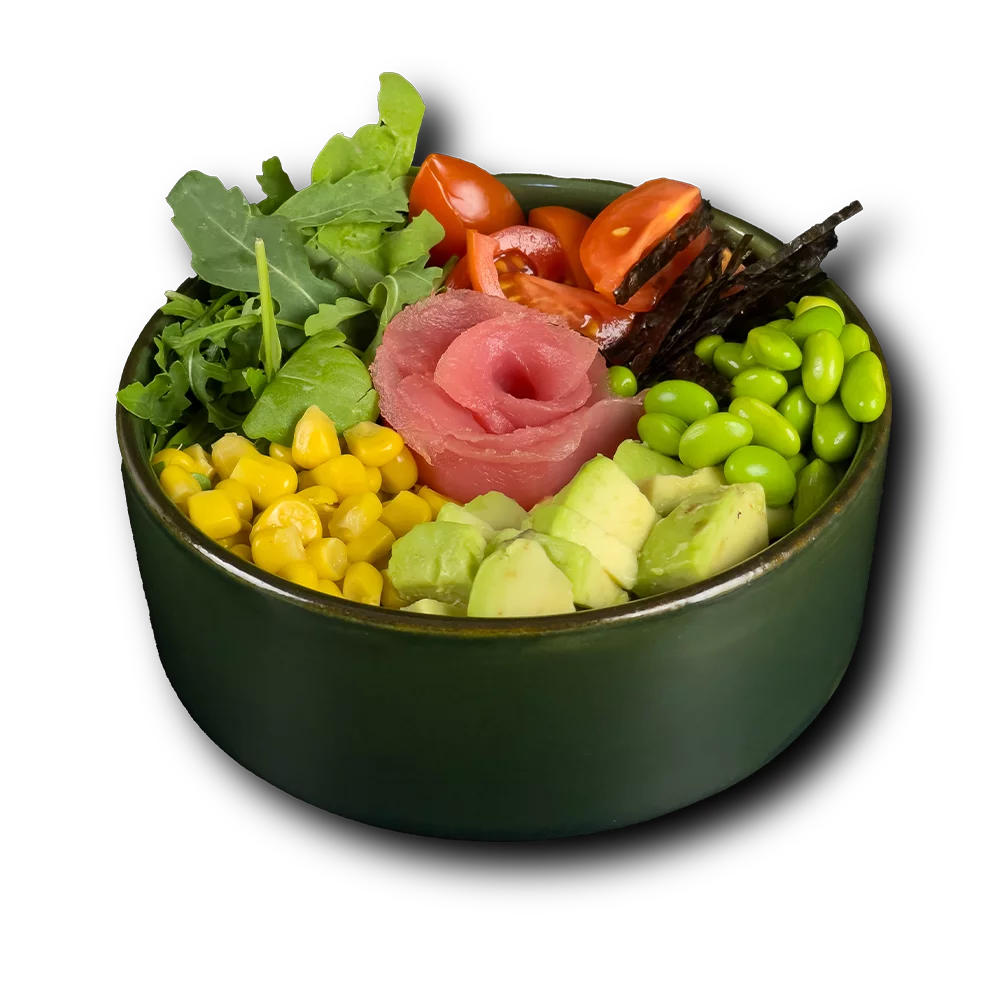 Frozen tuna, rice, avocado, cherry tomatoes, edamame frozen soybeans, arugula, corn
