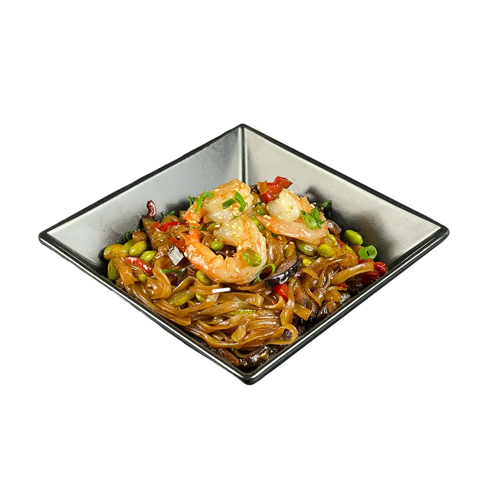 Rice noodles, breaded shrimp, bell pepper, zucchini, eggplant, shiitake mushrooms, edamame soybeans, soy sauce, sweet chili sauce, teriyaki sauce, oyster sauce, tuna flakes, sesame seeds, green onions, oil sesame, microgreens.