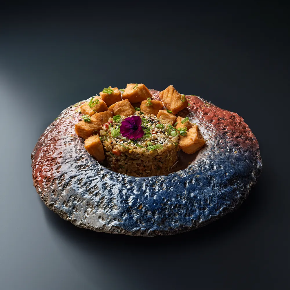 Somon, orez, ardei, dovlecel, morcovi, ou, ceapă verde, susan mix, sos de soia, usturoi.