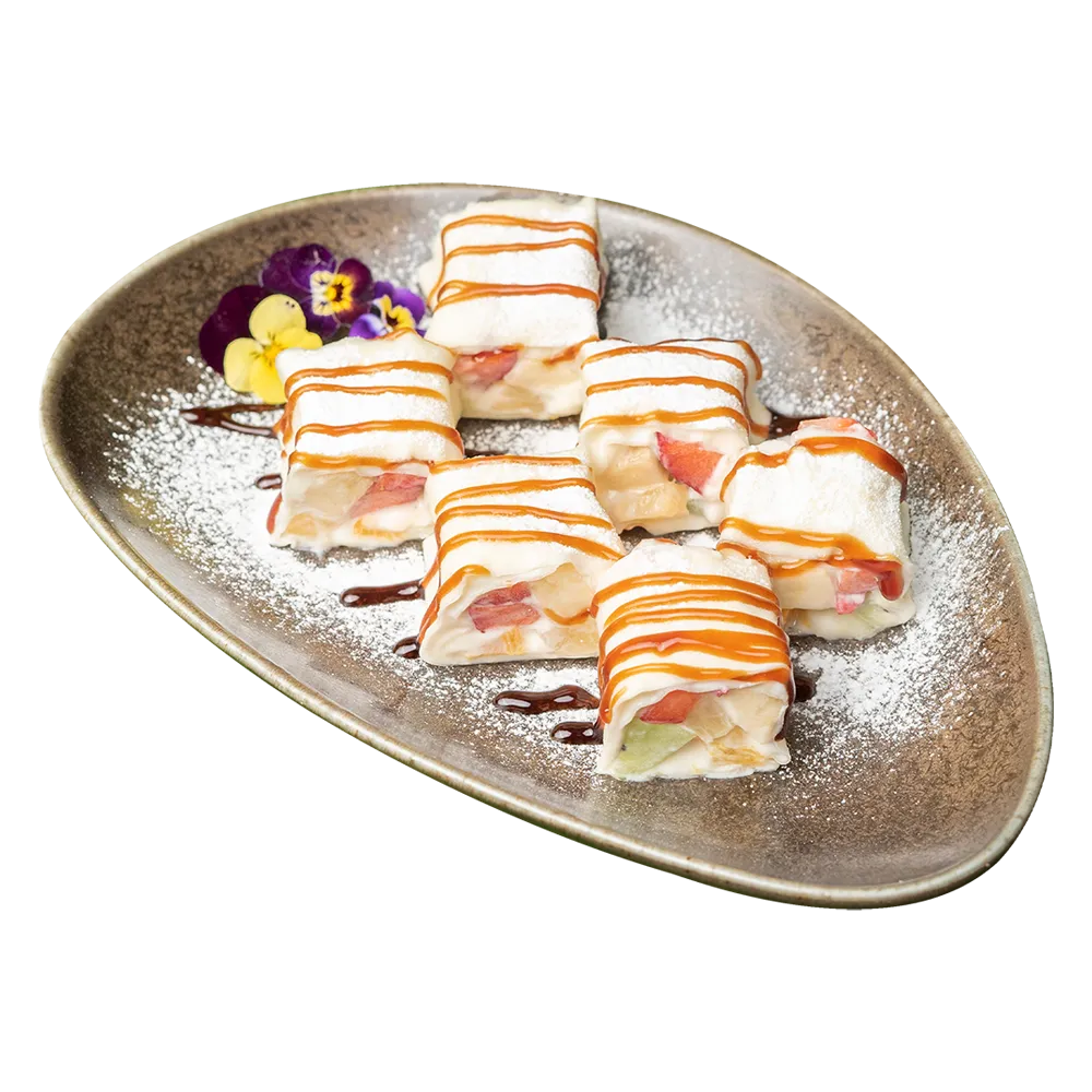 Cream cheese, powdered sugar, bananas, kiwi, strawberries, pineapple, oranges, rice dough, topping of your choice.
