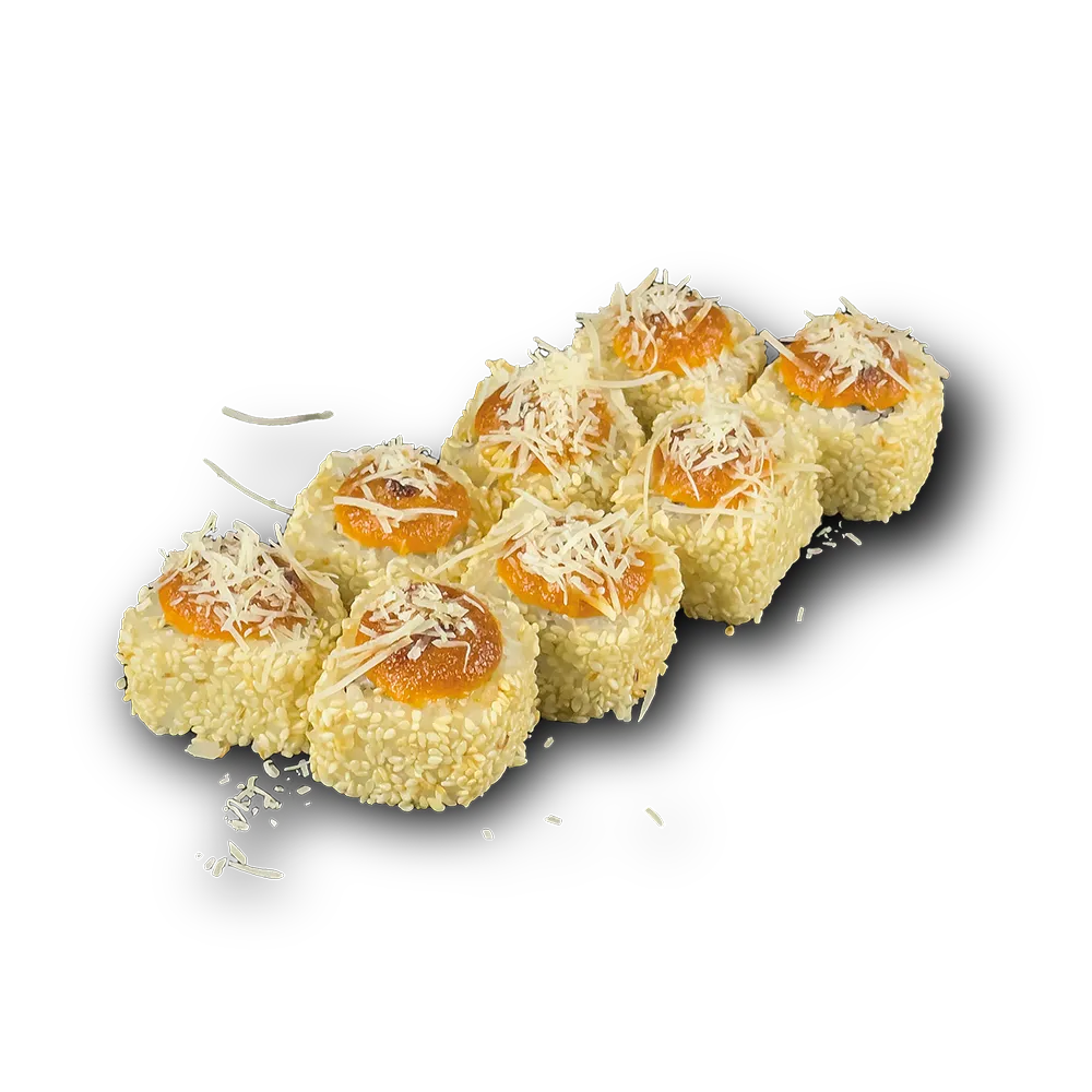 Orez, alge nori, susan, pui afumat, cremă de brânză, sos baked, parmezan.