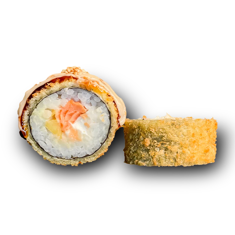 Somon prăjit, orez, mango, cremă de brânză, făină tempura, alge nori, sos de susan, seminţe de susan.
