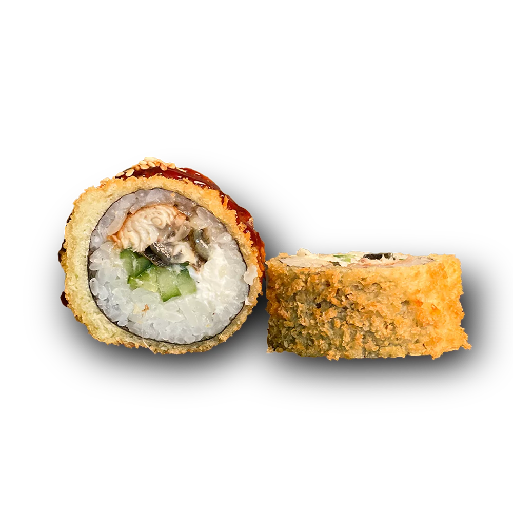 Anghilă prăjită, orez, castraveți, cremă de brânză, făină tempura, sos unagi, susan, alge nori.