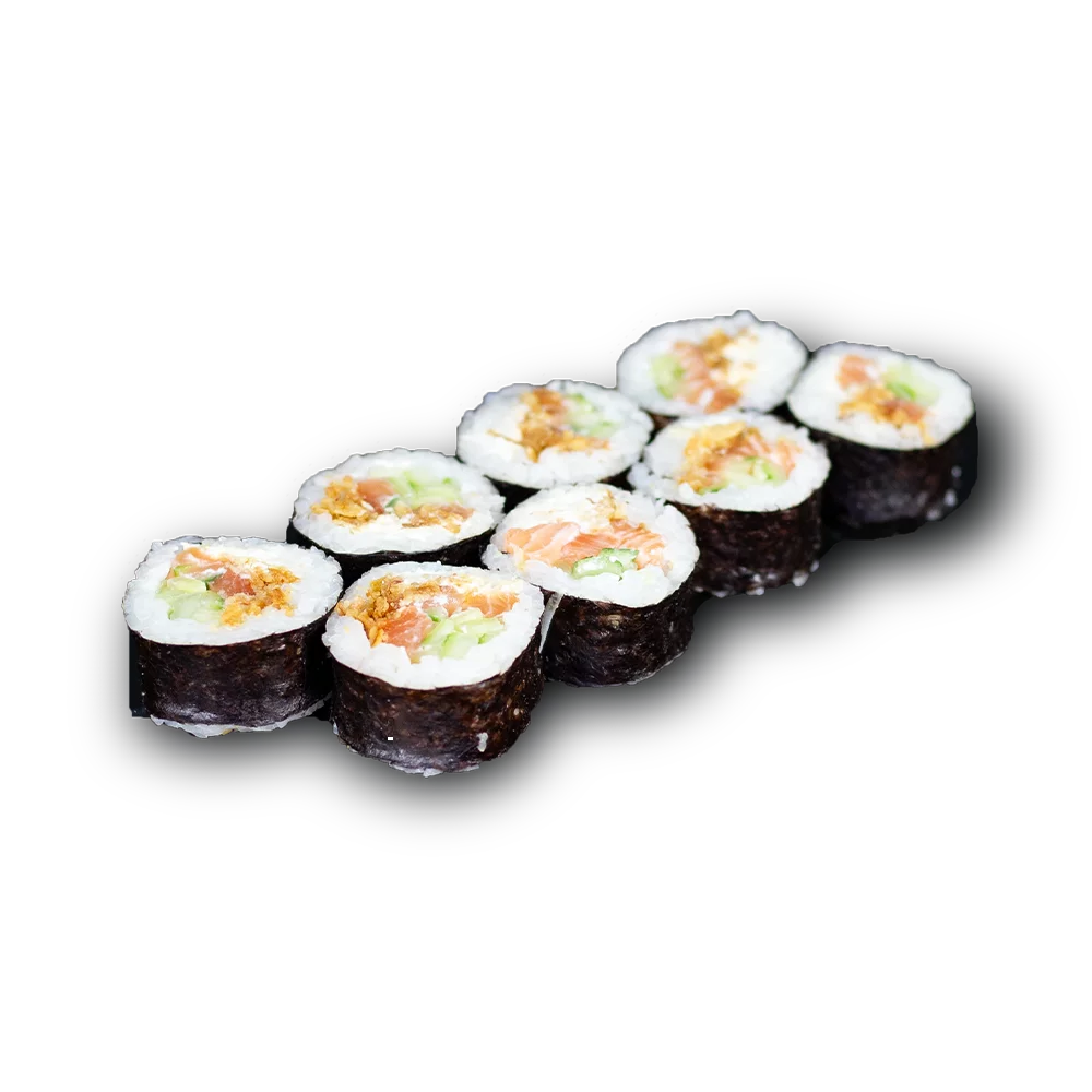 Somon proaspăt, cremă de brânză, castraveți, orez, alge nori, ceapă prăjită.