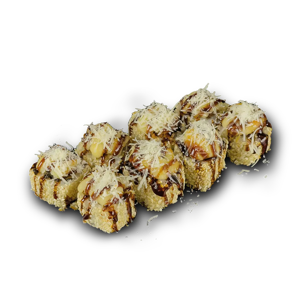 Orez, alge nori, susan, anghilă prăjită, cremă de brânză, castraveți, parmezan, sos unagi, maioneză, ardei gras.